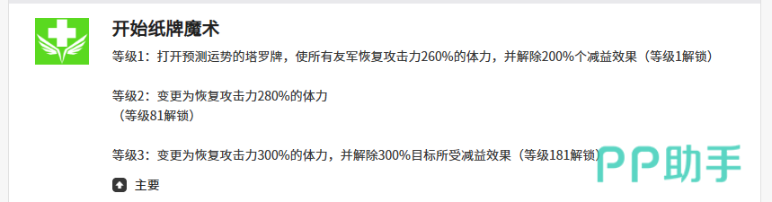 在弗里姆的各项效果里面,可以用自身的主要技能开始纸牌魔术这个效果打开很多的塔罗牌,然后根据塔罗牌的能力,可以让友军身上带来攻击力提取260%的体力恢复,而且接触了200%的减益效果之后,这个角色自身可以带来的恢复体力还是非常多的,所以放在辅助位置上面,大家利用这一点来当弗里姆主要的使用功能也是不错的,另外她的辅助技能叫做应该不会出现鸽子吧,使用这个技能的时候,特效当中会出现一群被放飞的鸽子,然后以当前天这个数值最低的队友作为弗里姆当前使用技能的这一目标,可以在1.8m的宽幅度,然后长达8m的范围之内,所有的队友都达到攻击力上面130%的体力恢复,拥有这样体力恢复的时候,我方的角色在生存效果上面持续的时间会更长,另外对于这个范围之内她会覆盖到的敌人则会造成在攻击上面130%的伤害,所以使用这个技能带来的双重效果是一边对敌人攻击一边针对我方进行恢复,这个技能目前使用起来场内大家需要的情况也会比较多。