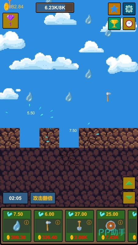 本款游戏的灵感来自于成语“水滴石穿”,这意味着这款游戏考验的是玩家的耐心。游戏的核心目标只有一个,就是击穿顽石。尽管水确实可以将顽石击穿,不过想要达成目标却并不一定非要用水滴。游戏还提供了各种不同功能的工具,如铁锹、铲子、镐头等等,这些工具在使用过程中还会伴随着熟练度的增加而升级,解锁更多功能。