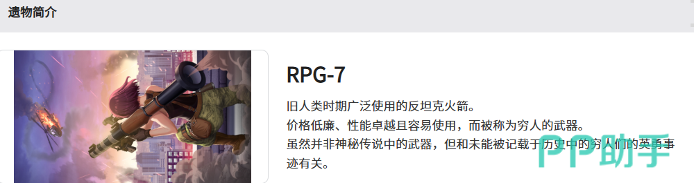她的遗物是rpg-7,这个遗物的外观就是一个反坦克火箭,而且性能是非常不错的,利用这个遗物她可以触发的技能效果是弗林的魔法棒,利用技能她可以触发一个人更自在的效果,新增的暴击率也会增加8%的数值,而且改到周边2.5m之内范围只要没有其他敌人的时候就可以发动这个技能了,此时就算有队友在旁边,她也是可以一样进行触发的,然后发动的技能是火药味好好闻这个技能,此时用到一般攻击的话会对攻击的目标造成60%的额外伤害效果。