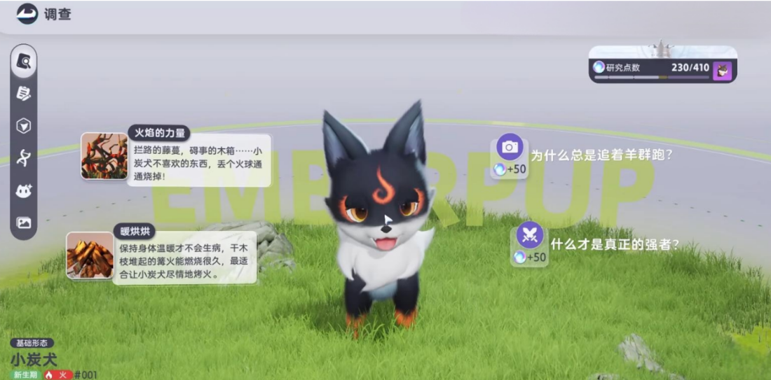小碳犬在开局的区域就能抓到,别看它不起眼,实际用处挺大的。平时可以用它来点篝火,或者烧掉那些盖在宝箱上的荆棘。后续还能进化成焚火狼或者狼斗士,最终形态狼斗士在前中期,算是相当能打的火系角色了。它的蓄力攻击爆发很高,用来清理成群的小怪特别顺手,实用性摆在那里。