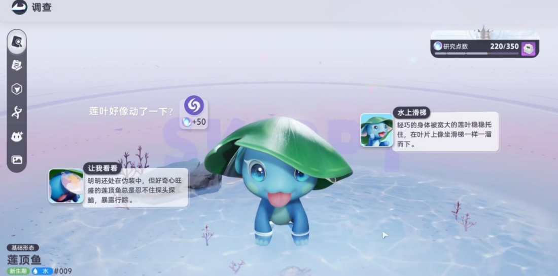 蓬顶鱼是前期最容易捕捉的水系宠物,虽然输出方面不算突出,但是它能给队伍提供治疗,相当于一个奶妈的角色。进化成顽皮鱼之后,还能获得游泳加速的能力,这在前期探索的时候帮助很大。最后进化成冰莹龙,冰水双属性,外形看起来也挺可爱的,攻击能力提升了不少,可以应对很多不同的战斗场景。