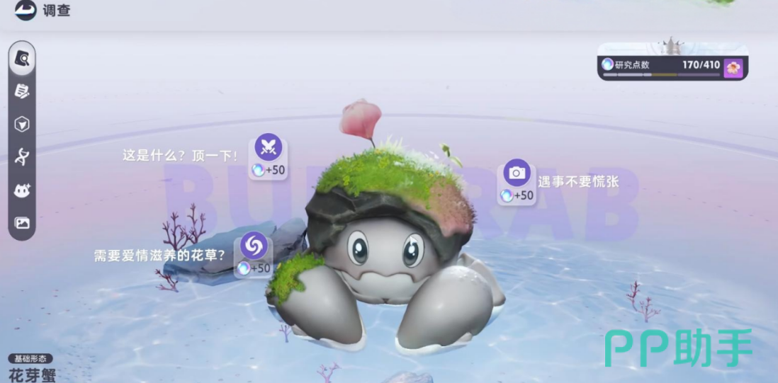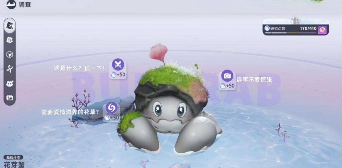 花芽蟹是草加土的双属性,有好几种不同颜色的地区形态。它平时会躲在土里面,需要靠近或者用技能,才能把它找出来。探索技能有遁地和碎岩,可以躲开远程攻击,还能探索石头后面藏着的宝藏,前期用处挺实在的。