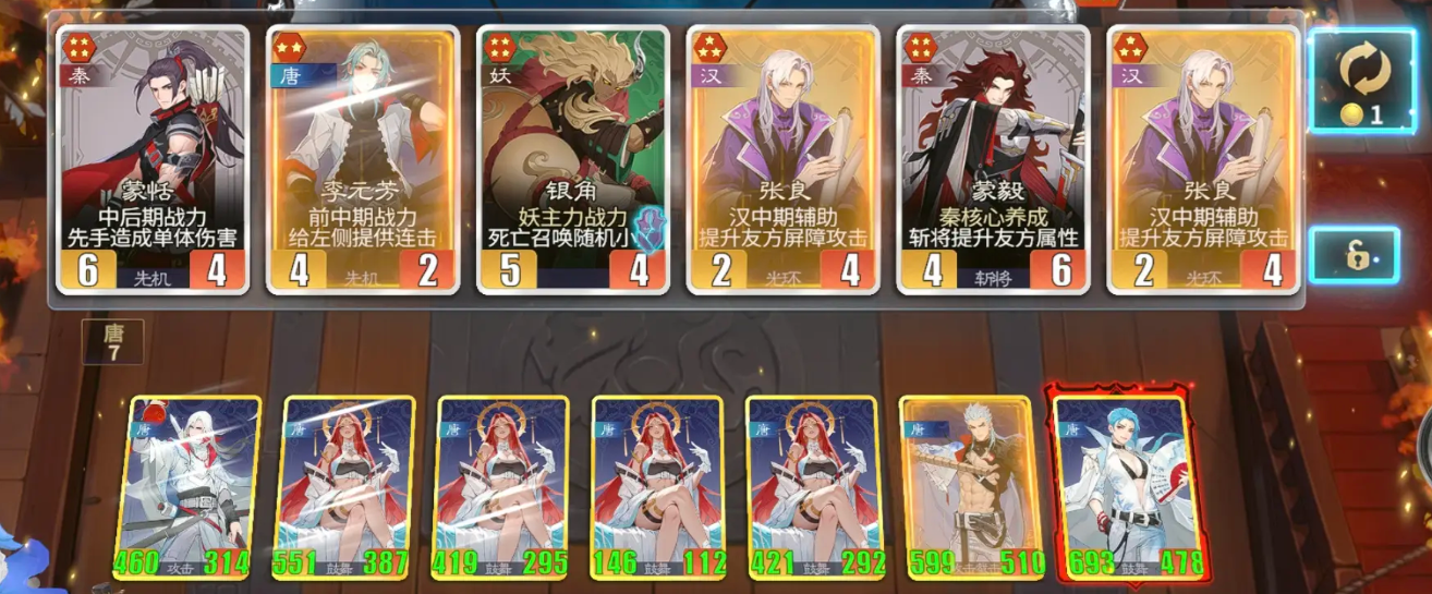 汉阵营其中可用的卡牌里面有王昭君以及李广,这两张卡他们基础达到了四费强度都可以让掌上的能力带来双重核心,因为他们俩释放的输出跟控制都是可以同时放在一起用的,有了这样的输出基础,后期再搭配其他卡牌的时候要注意阵营里面其实可以搭配一些六费卡,虽然六费卡当前在使用效果上面褒贬不一,但是如果大家用过卫子夫和霍去病之后就会知道他们俩能够达成的上限能力确实是非常完美的,而且这两个角色相对于其他角色来说,获取难易程度没有那么高,而且阵容强度当中如果完成汉阵营的搭配,那么前排是可以放双核心的,此时整体阵容强度到位以后大家就可以造成更多的场内效果了。