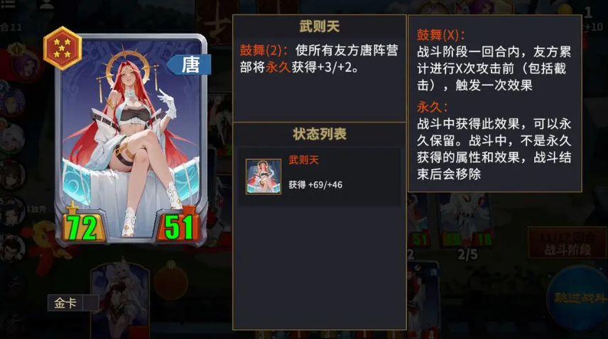 武则天当前作为前中期非常适用于过渡期使用的角色,后期如果达到六星的话,其实成型速度也是比较快的,因为她在建立各种启动机制的时候,达成的体系是比较强势,一旦入手成功,武则天在这里可以通过其余的组件获取更高的场内行动效果,整体容错率相对于其他阵营来说也是比较高一些,唐阵营当中大家还可以抽取到的角色也比较多,当前在属于新人友好期里面的话,利用这个唐阵营里面的各个角色卡牌也可以组建起来主流派的能力,另外如果想要均衡效果的话,其实玩家可以做的是汉阵营的流派能力,汉阵营当中各个卡牌的效果都是相对来说具有平衡特点的,而且在站位效果上面,通过重击培养可以达到突出的数值。