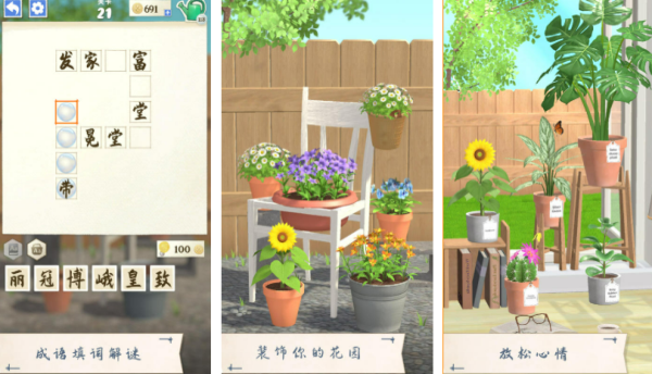 该游戏以花园种植为背景,玩家每完成一个成语任务,就能够解锁新的植物或者装饰。例如玩家在解锁春暖花开这个成语之后,便能解锁樱花树这一装扮。并且其玩法还包括成语填空,看图猜成语等传统的成语玩法。例如该游戏会展示守株待兔的插画,从而来让玩家们猜这是什么成语哦!