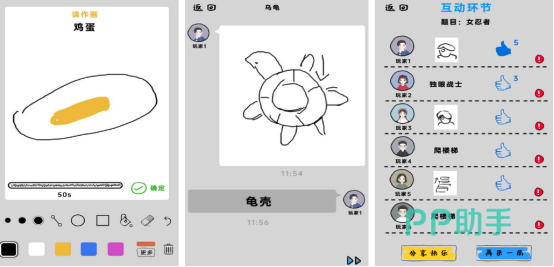 基于画画接龙的玩法所创作,其中有经典模式,最多可以支持6人共同加入,比如通过画猜画猜的主要流程猜出正确的答案,在开局之后游戏会随机给出不同的题目,就比如需要画乌龟,或者是需要画其他的物体等等啊,其中第1位玩家就需要根据自己所看到的题目画出精美的画作,另外一位玩家还需要猜出正确的答案,这样循环经历,直到所有人都画完为止。