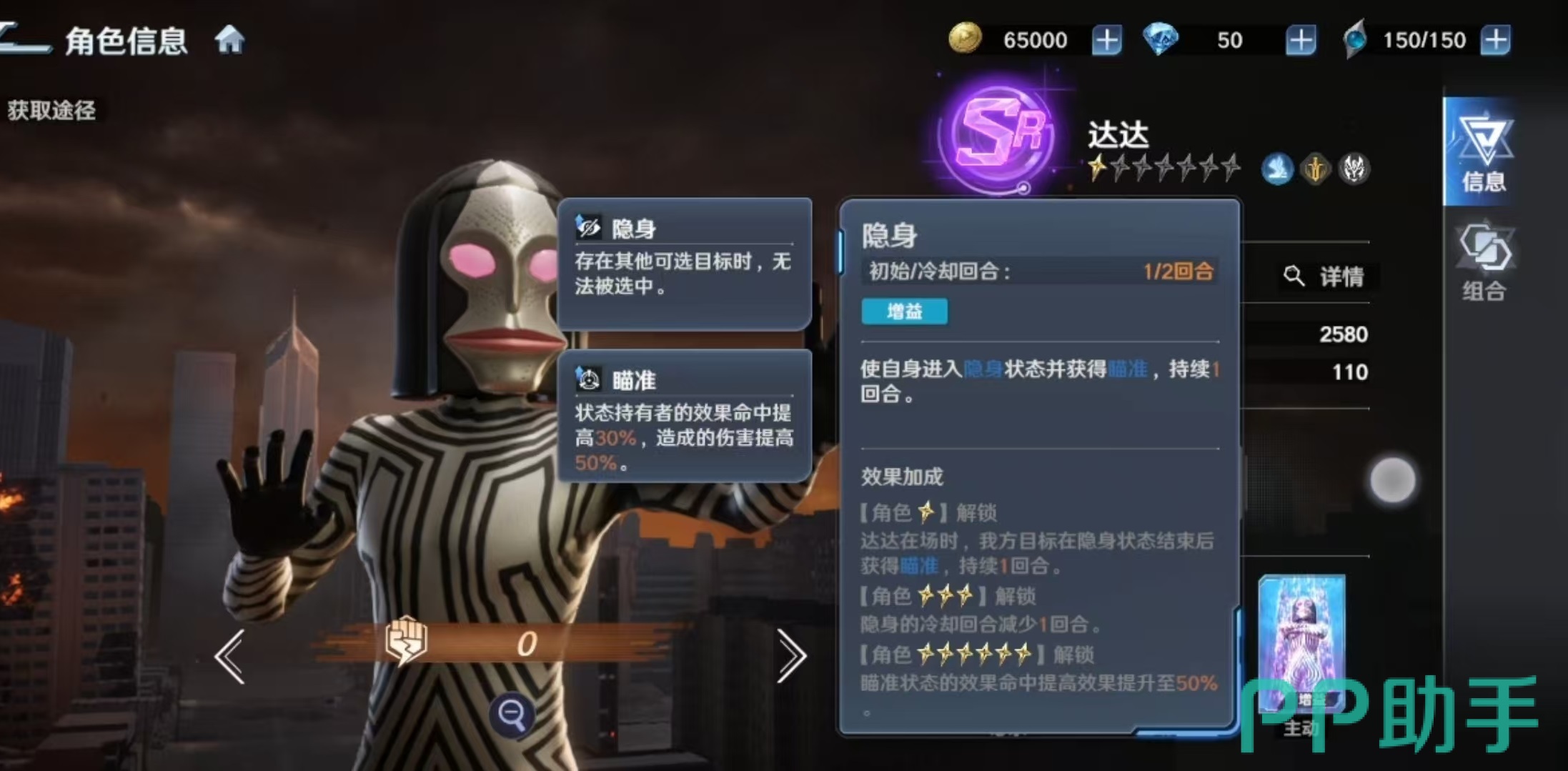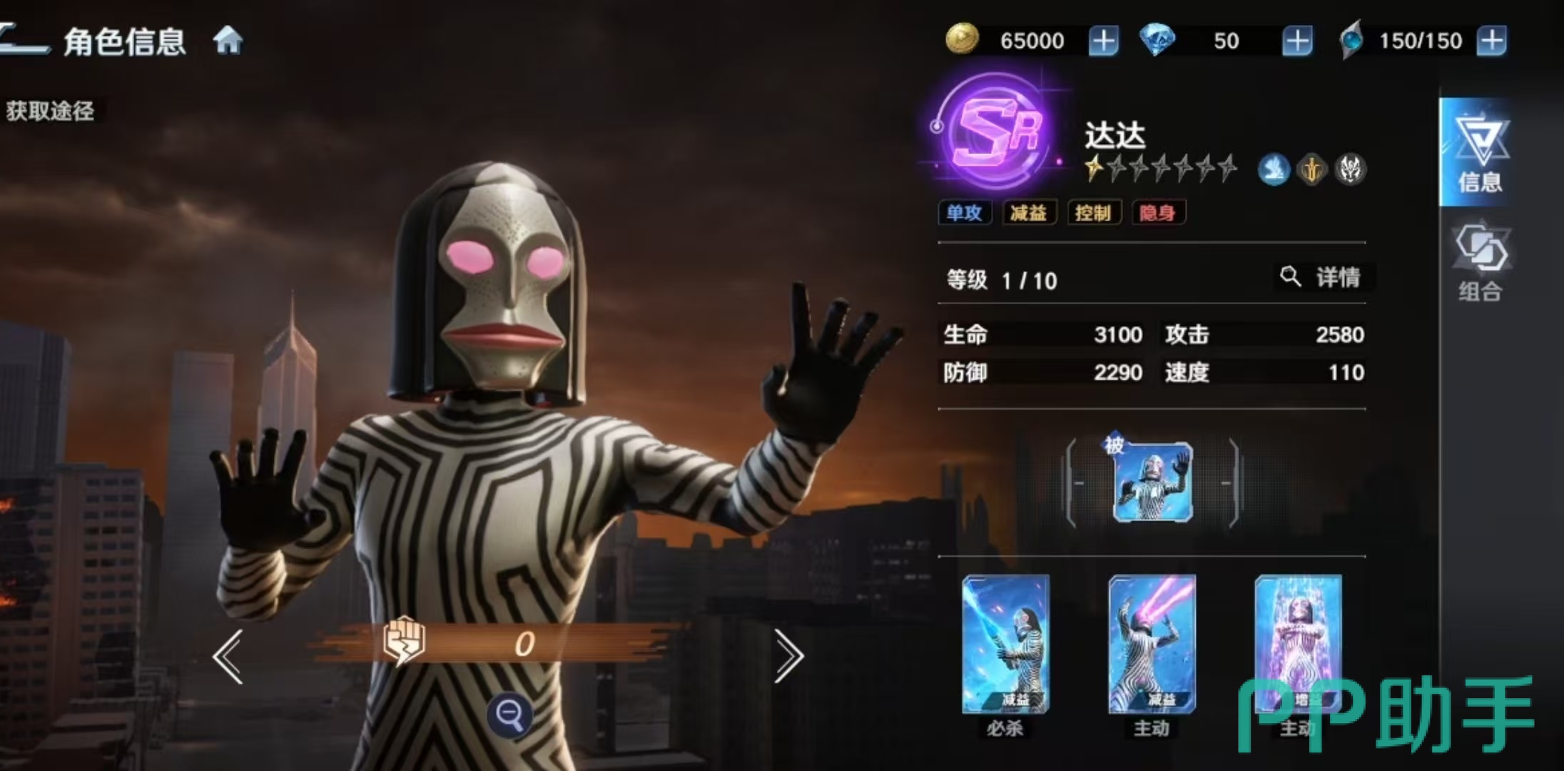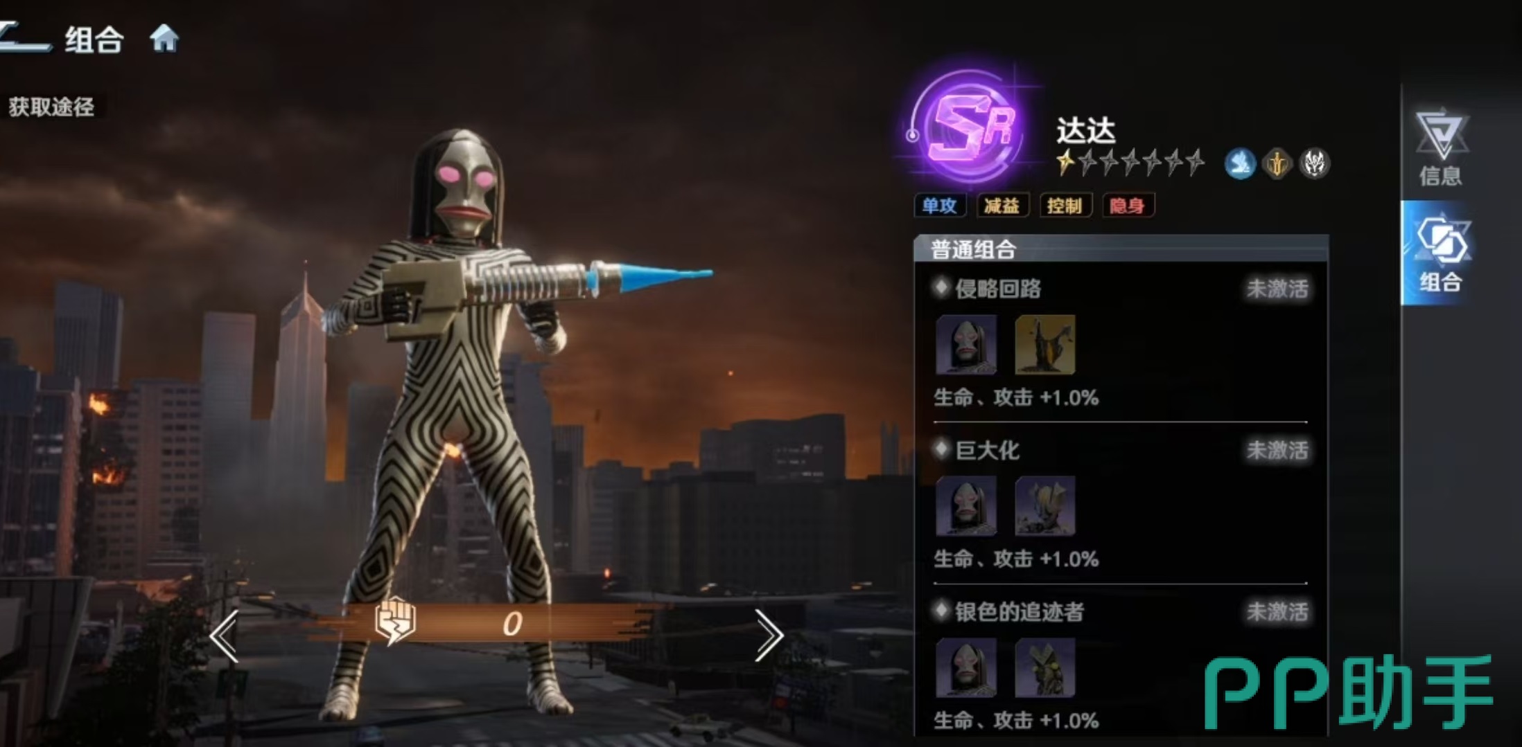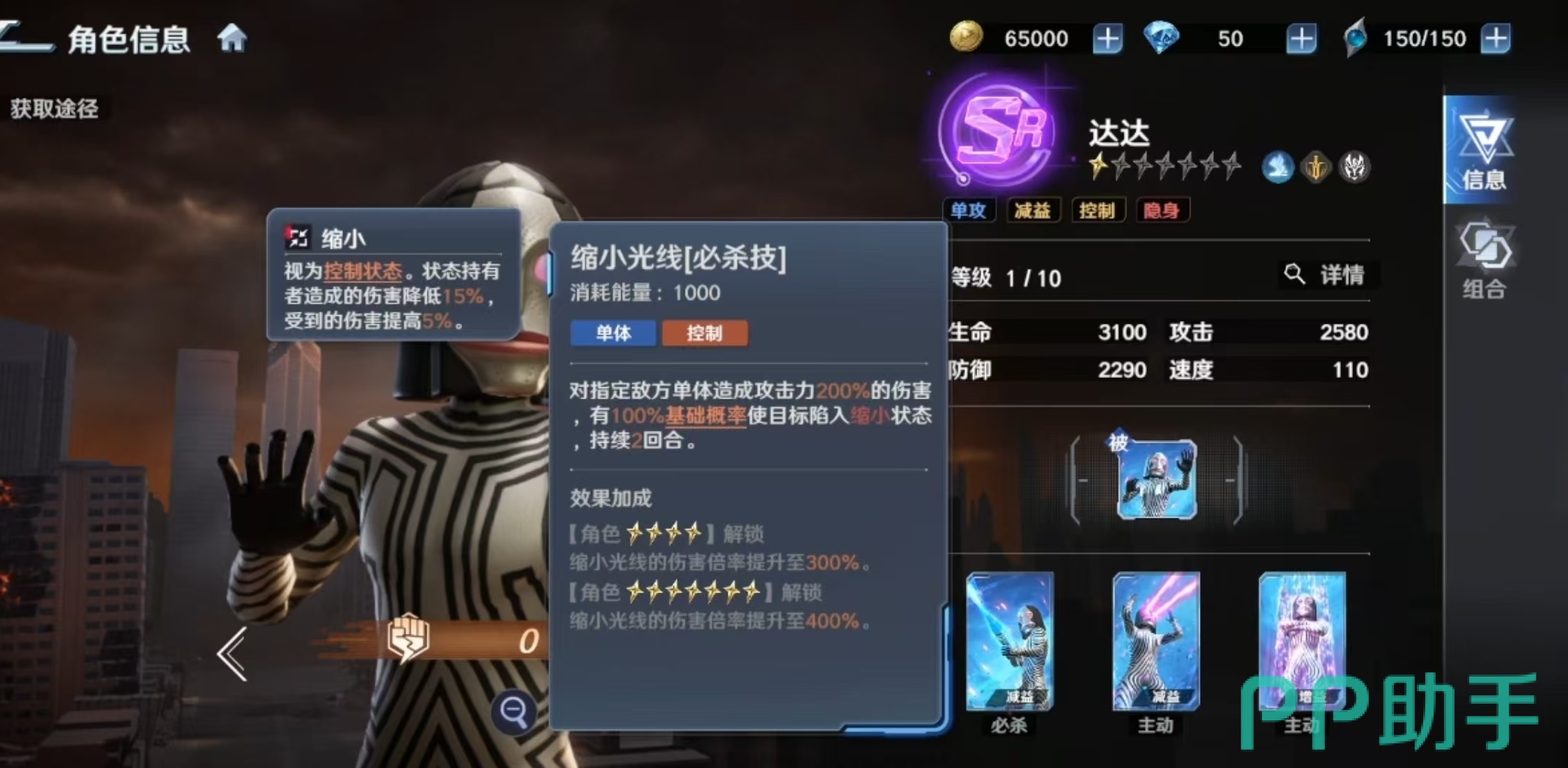 达达的核心输出技能为必杀技“缩小光线”,可对敌方单体造成伤害,并有概率施加持续两回合的“缩小”状态。该状态属于硬控类效果,能显著压制对方主力输出单位的行动能力,在单核阵容对抗场景中尤为关键。随着技能等级提升,基础伤害倍率同步增强。另一主动技能“眼部光线”则提供单体伤害与眩晕控制,星级提升后伤害与触发概率均有所提高,但受限于SR品质,整体眩晕稳定性仍处于中等水平。此外,“隐身”为其核心生存技:发动后进入不可选中状态,同时获得“瞄准”效果;若场上存在其他可攻击目标,则自身不会成为敌方技能或普攻对象,大幅延长站场时间。