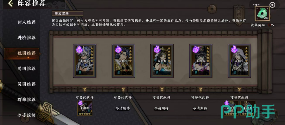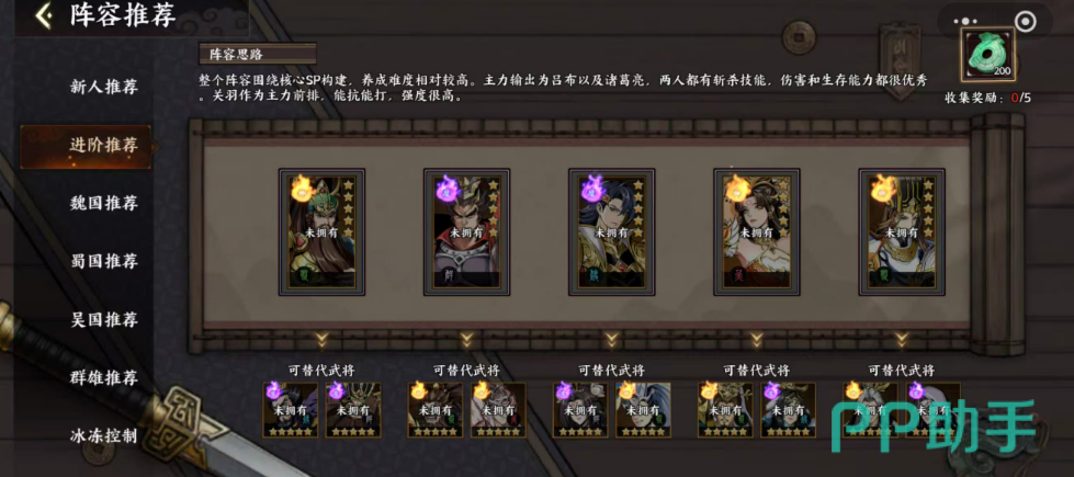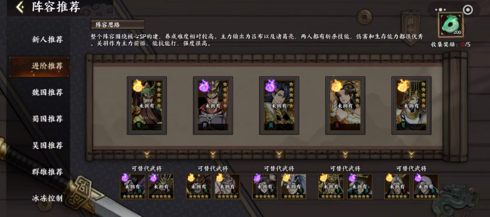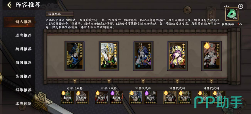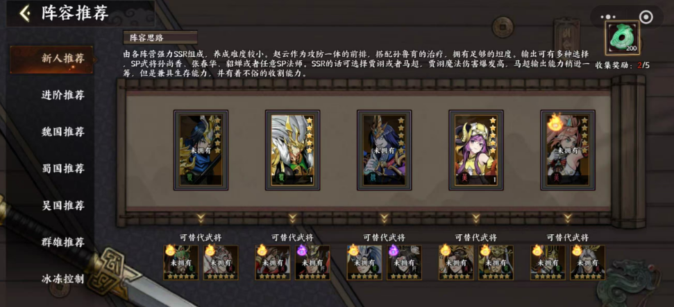 【平民友好型开荒阵容】 核心定位:低资源门槛、高容错率、平滑过渡 推荐配置:赵云(前排主坦兼输出)、马超(物理收割手)、贾诩(法系爆发核心)、孙鲁育(群体治疗+续航)、孙尚香(持续物理输出) 该组合全部成员均为SSR品质,获取路径清晰,升星与技能升级所需材料总量可控。赵云凭借高生存与稳定输出能力,配合孙鲁育的多段治疗与护盾,大幅降低站位压力;马超在保证自身存活前提下可对残血目标触发额外斩杀伤害;贾诩则依靠高额智力加成,在中后期释放大招时打出成吨AOE爆发。若缺少孙尚香,张春华可作为优质替代;若缺乏贾诩,貂蝉亦能胜任法师位,其SP品质带来的属性加成足以支撑中期战力需求。整体配比注重攻守均衡,无明显短板,是新手前15日最稳妥的选择。