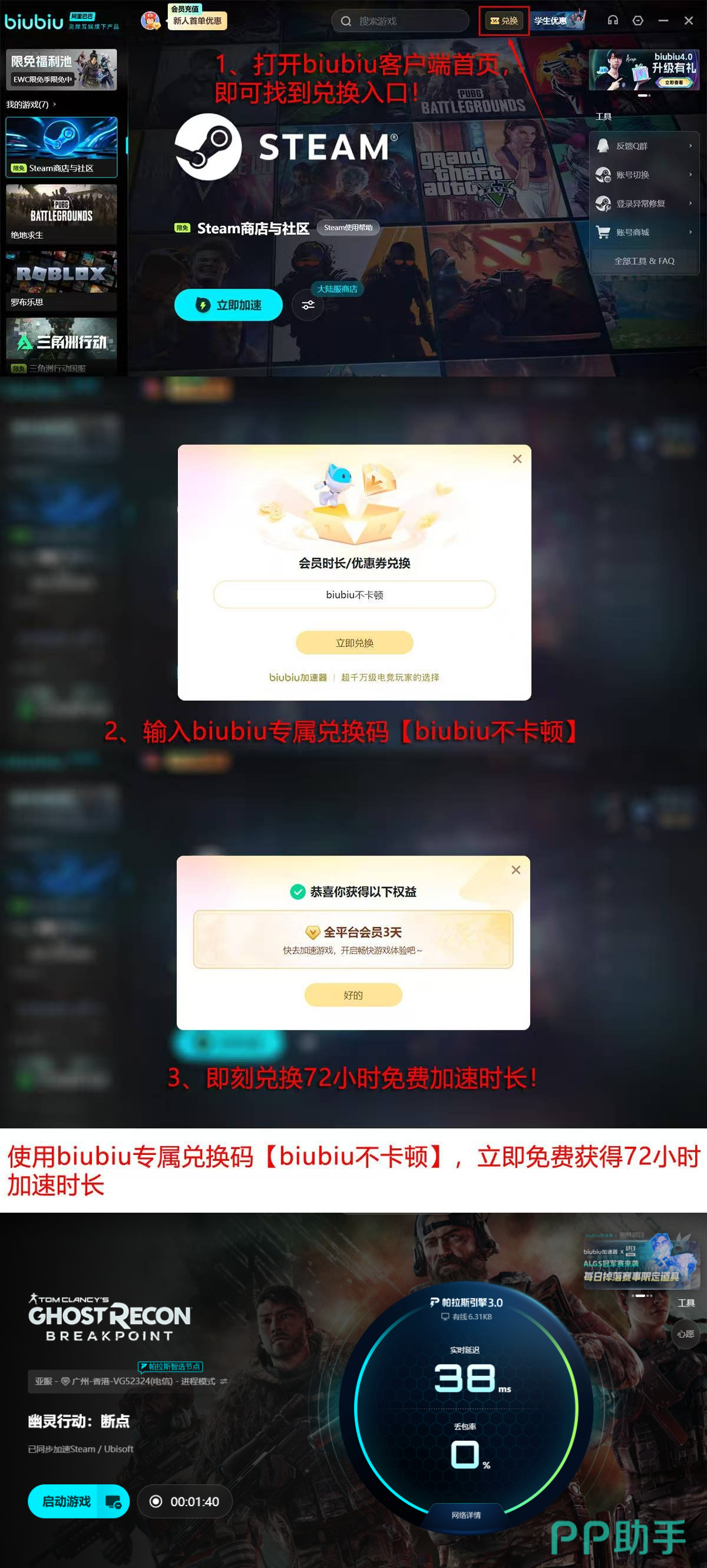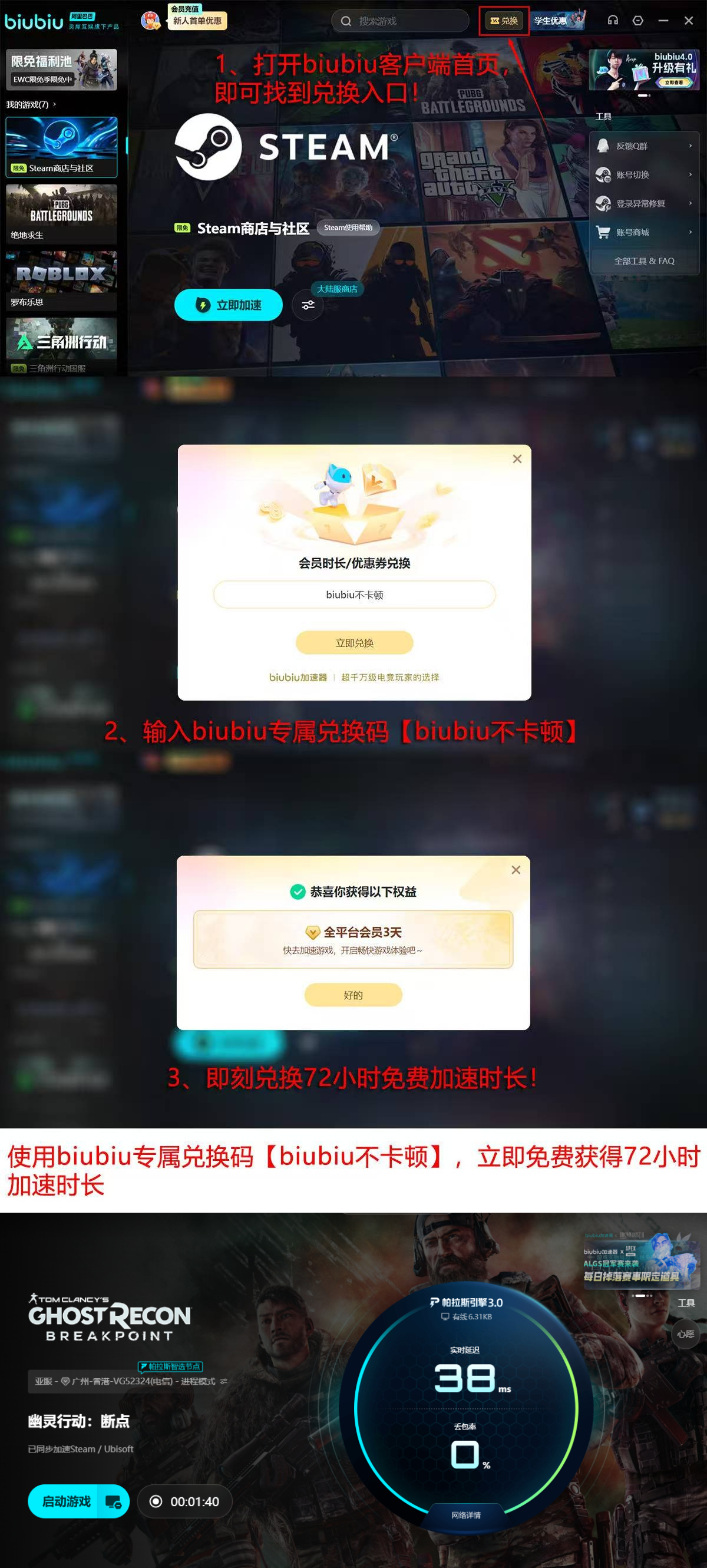 为帮助新用户切实验证优化效果,biubiu加速器提供无门槛试用机制:完成首次注册即可激活24小时全功能加速权限;输入激活码【biubiu不卡顿】还可额外领取72小时高级加速时长,总计96小时连续可用时间,足以覆盖多轮完整任务周期,包括主线推进、据点争夺及高难度突袭挑战,便于玩家在真实对抗环境中全面评估性能提升幅度。