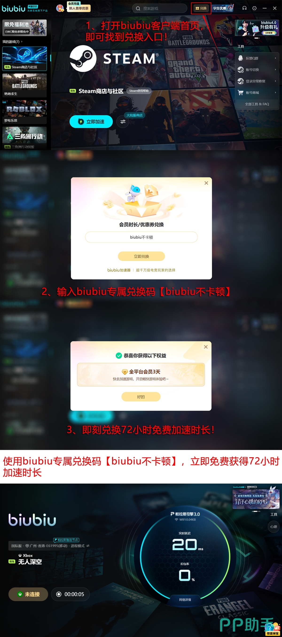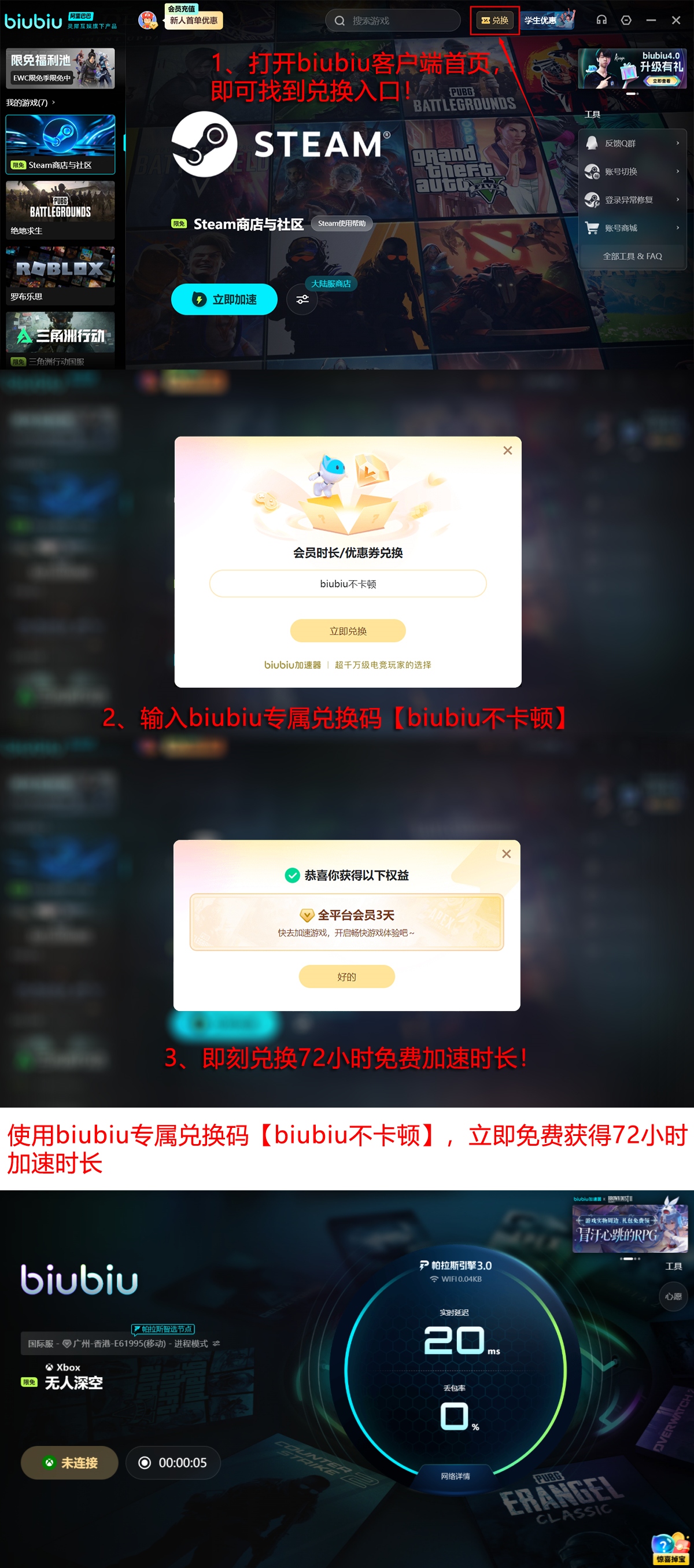 新用户完成注册后,可立即激活24小时全功能免费加速权限,用于全流程实测——涵盖星图初始化、首次跃迁、多人会话建立及模组安装等典型操作。所有账号均可凭兑换码【biubiu不卡顿】额外领取72小时加速时长。两项权益叠加后,总计享有96小时无限制使用周期,足以支撑完整的新手引导、多个星系深度勘探及至少一次跨服基地共建项目。
