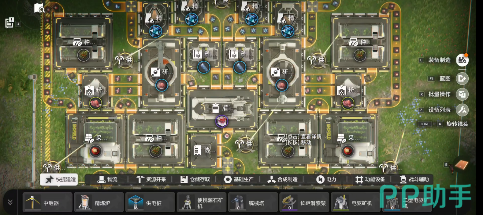 在布局设计上需分阶段优化:前期可将种植机与采种机紧凑串联,提升单位面积原料转化率;进入中期后,建议划分独立原料供应区,集中部署3–4组采种机,专供胶囊产线。该结构具备材料兼容性优势——初期使用紫晶矿生产普通胶囊,待蓝铁矿解锁后,仅需更换原料类型即可无缝切换至中级胶囊生产,无需拆除重建,显著节省空间与基建资源。