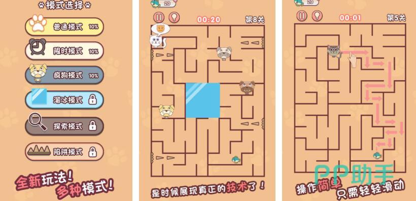 《迷宫闯关达人》的主角是一只可爱的小猫咪,玩家可以操纵小猫咪在复杂的迷宫中收集小鱼干并寻找出口。目前共有普通和现实等六种模式,不同模式下解谜的方式也不同,包含了很多动态机关,比如障碍移动和随机陷阱等,且部分关卡还拥有会说话的动物提供线索。关卡难度从简单到复杂,玩家还可以与好友比拼排名。