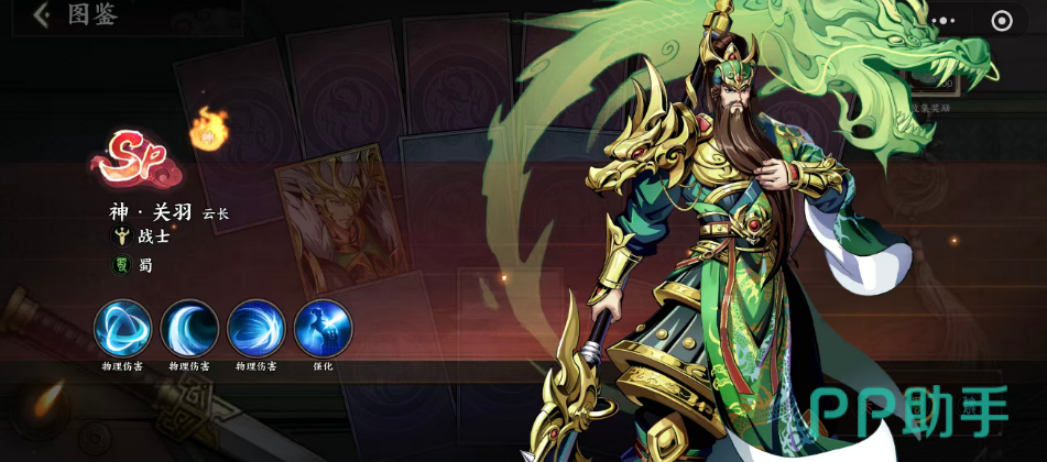 第四位推荐SP级武将神关羽。身为蜀国顶尖近战战士,其技能组合强调控制衔接与生存反哺:一技能配合青龙偃月刀特效,对指定区域发动大范围横扫,造成660%攻击力伤害并附带强力击退与击飞效果;命中后自动触发被动恢复,回复自身10%最大生命值;若在大招期间完成击杀,则额外获得100点固定生命值恢复,进一步强化其持续作战韧性。