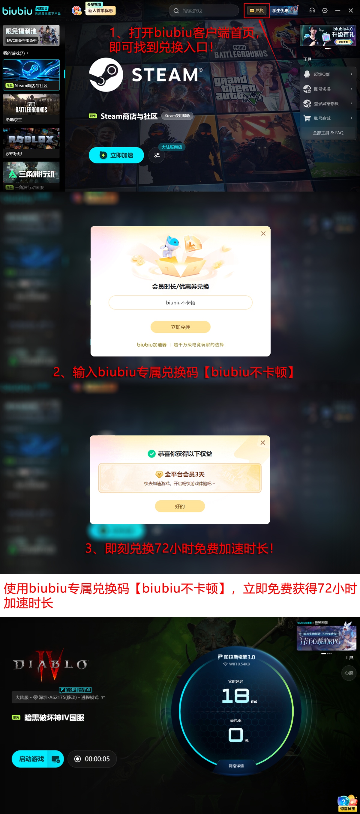 新用户完成注册并登录后,立即获得24小时全功能免费试用权限;所有用户(含老用户)输入专属激活码【biubiu不卡顿】,即可额外领取3天加速服务权益。综合计算,新用户最高可享累计96小时无限制体验,足以覆盖多个赛季活动周期、高难秘境开荒及团队协作副本全流程测试。