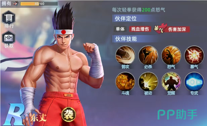 在《全明星觉醒》中,东丈作为经典格斗家角色登场,虽定位为R级稀有度,但凭借独特的机制设计,在特定战斗场景下仍具备不可忽视的战术价值。不少玩家因童年情怀对该角色抱有好感,而实际体验中,其技能体系围绕“血量阈值触发”展开,强调残血状态下的爆发转化能力,需玩家精准把握节奏才能发挥最大效用。