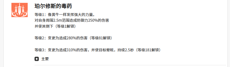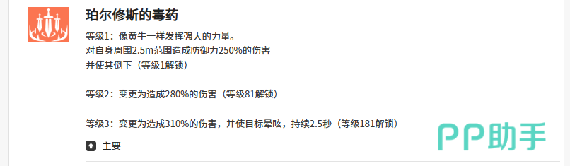 一技能【珀尔修斯的毒药】为范围攻击技,作用半径2.5米,造成等同于自身防御力250%的物理伤害,并附带概率性“倒下”状态。该状态不仅中断敌人行动,更可作为后续控制链的起手点,显著延长敌方单位的无效化时间。