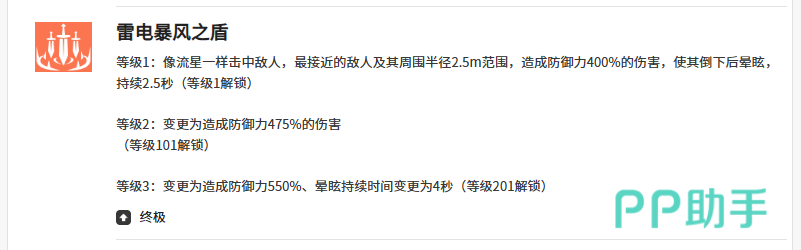 终极技能【雷电暴风之盾】兼具爆发与强控:对2.5米内敌人造成400%防御力的高额伤害,并在目标处于“倒下”状态时追加2.5秒眩晕。此技能既可作为收割手段,亦可衔接其他控制技能,构成多段硬控组合,大幅提升队伍整体控场效率。