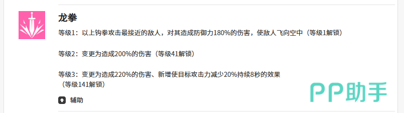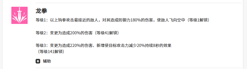 三技能【龙拳】为突进型打击技,以180%防御力转化为上勾拳伤害,并具备击飞效果;命中后还可降低目标20%攻击力,持续削弱敌方输出节奏。其被动【不屈不挠的意志】为濒危反制技:当克罗伊生命值低于35%且正被集火时自动触发,提供40%物理抗性与40%魔法抗性,恢复7%最大生命值,并返还一定能量。该被动整场战斗仅可生效一次,属关键保命手段。