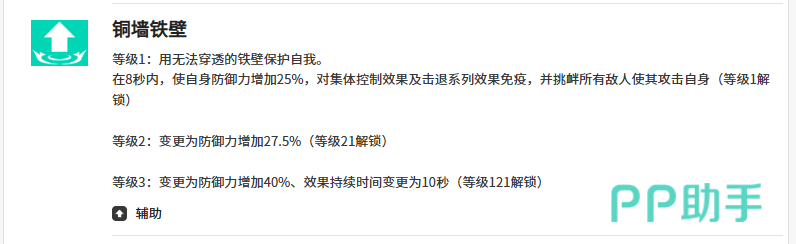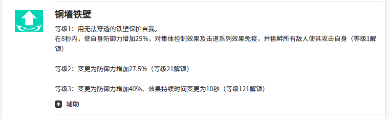 二技能【铜墙铁壁】提供周期性防护:每8秒自动激活,提升自身25%防御力;同时赋予气体类控制免疫效果,可完全规避击退、浮空等位移压制。该技能还附带强制仇恨机制——施放后立即对范围内所有敌人施加挑衅,使其将攻击目标锁定为克罗伊,是构建稳定前排防线的关键技能。