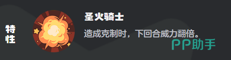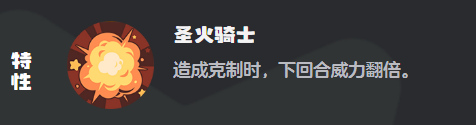其核心机制源于特性【圣火骑士】:每当炽心勇狮造成属性克制伤害后,下回合所有攻击技能的基础威力提升至200%。该效果不依赖随机判定,全程可控,是构建连段输出体系的关键支点。以对战水系精灵为例,首回合触发克制即锁定次回合翻倍增益,若敌方缺乏即时控场或减益手段,炽心勇狮将在第三、第四回合持续扩大输出优势,形成不可逆的节奏压制。
