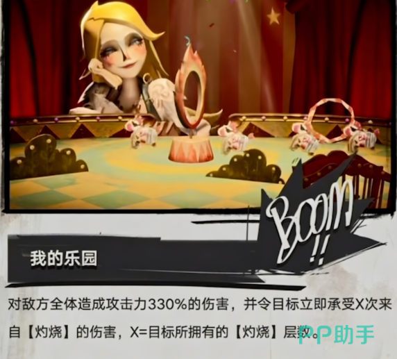 终极技能【乐园】:对全场所有敌人造成300%攻击力的范围伤害;每额外命中1名敌人,额外叠加1层灼烧;若满足羁绊条件,则激活“激昂”状态,使被命中的目标在后续行动中承受追加伤害。