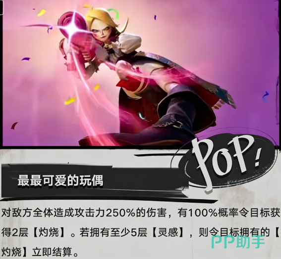 一技能【最可爱玩偶】:召唤玩偶发射制导导弹,对范围内全体敌人造成250%攻击力的群体伤害;命中后为目标附加2层灼烧效果;当单体目标灼烧层数累计达5层时,立即触发全额灼烧结算。