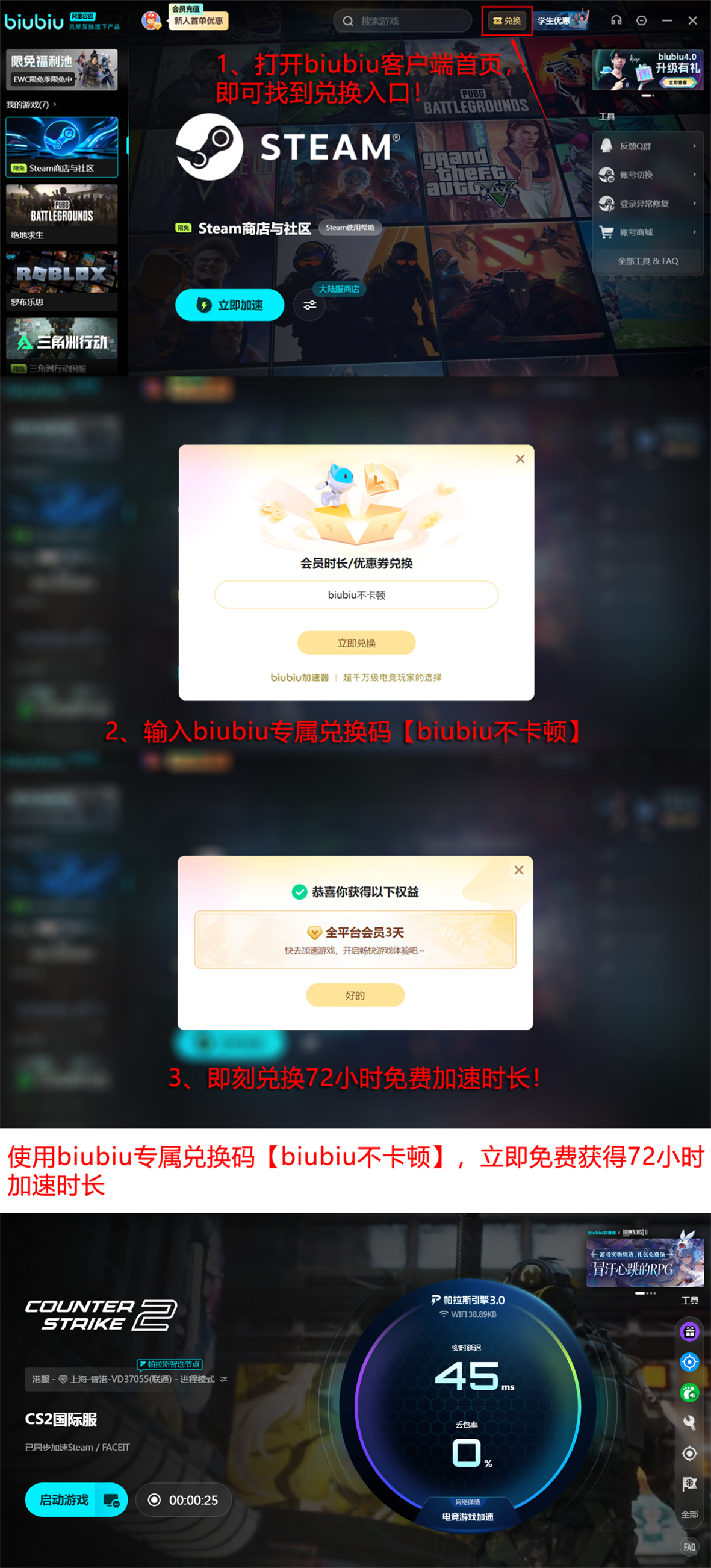 在服务资费结构上,biubiu实行会员订阅制,但为降低用户尝试门槛,新注册账号可享24小时全额免费加速权益。此外,官方同步发放通用兑换码【biubiu不卡顿】,每个账户限用一次,成功激活后可额外获得72小时加速时长。除核心加速功能外,平台还集成开放型游戏社区,支持玩家围绕CS2战术配置、地图点位解析、版本更新解读等话题展开深度交流,亦可实时获取一线赛事资讯与实战技巧分享。