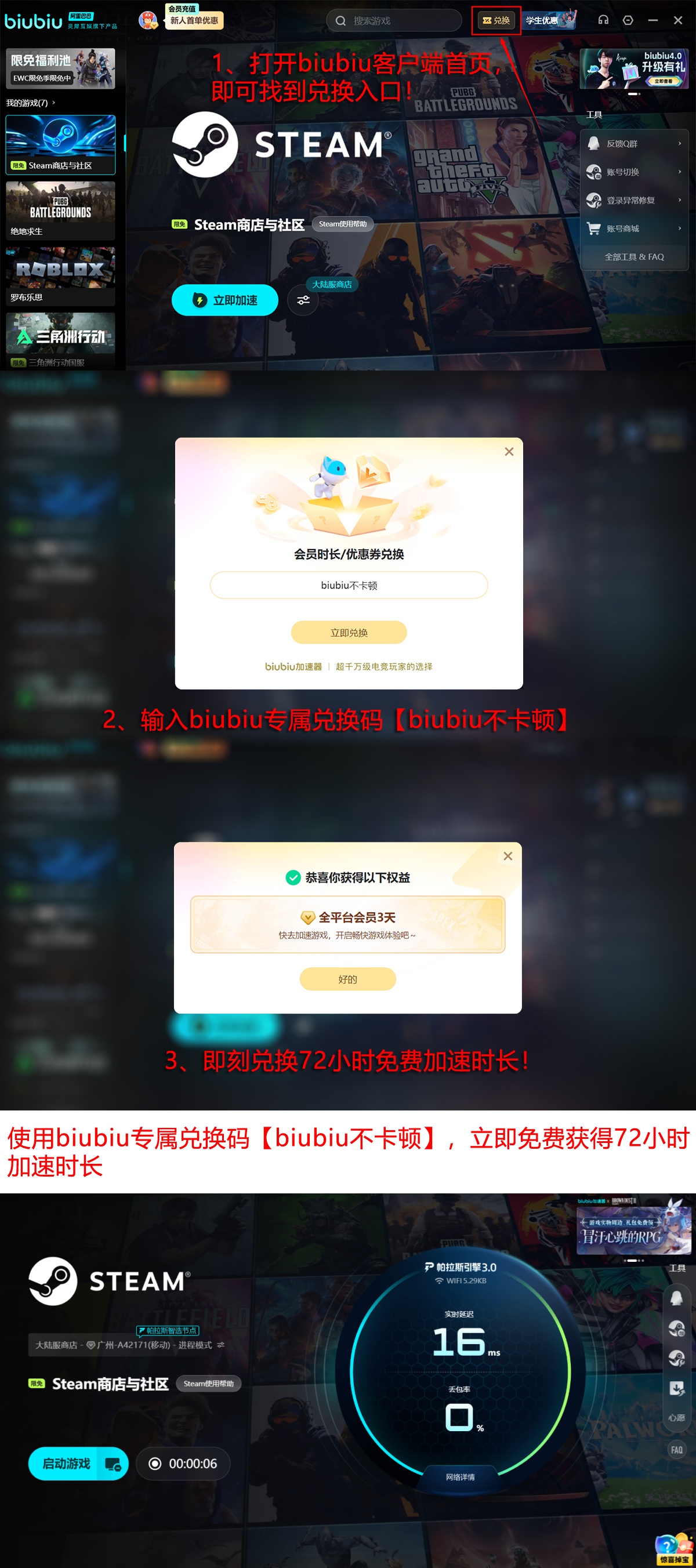 新用户注册后可立即获得24小时全功能试用权限。同时,在官方平台活动页面输入口令【biubiu不卡顿】,所有账户均可额外领取72小时加速服务时长。两项权益叠加,首次使用即可享受总计96小时无限制节点切换、无线路类型限制的深度体验周期,充分适配不同游戏环境下的实际需求。