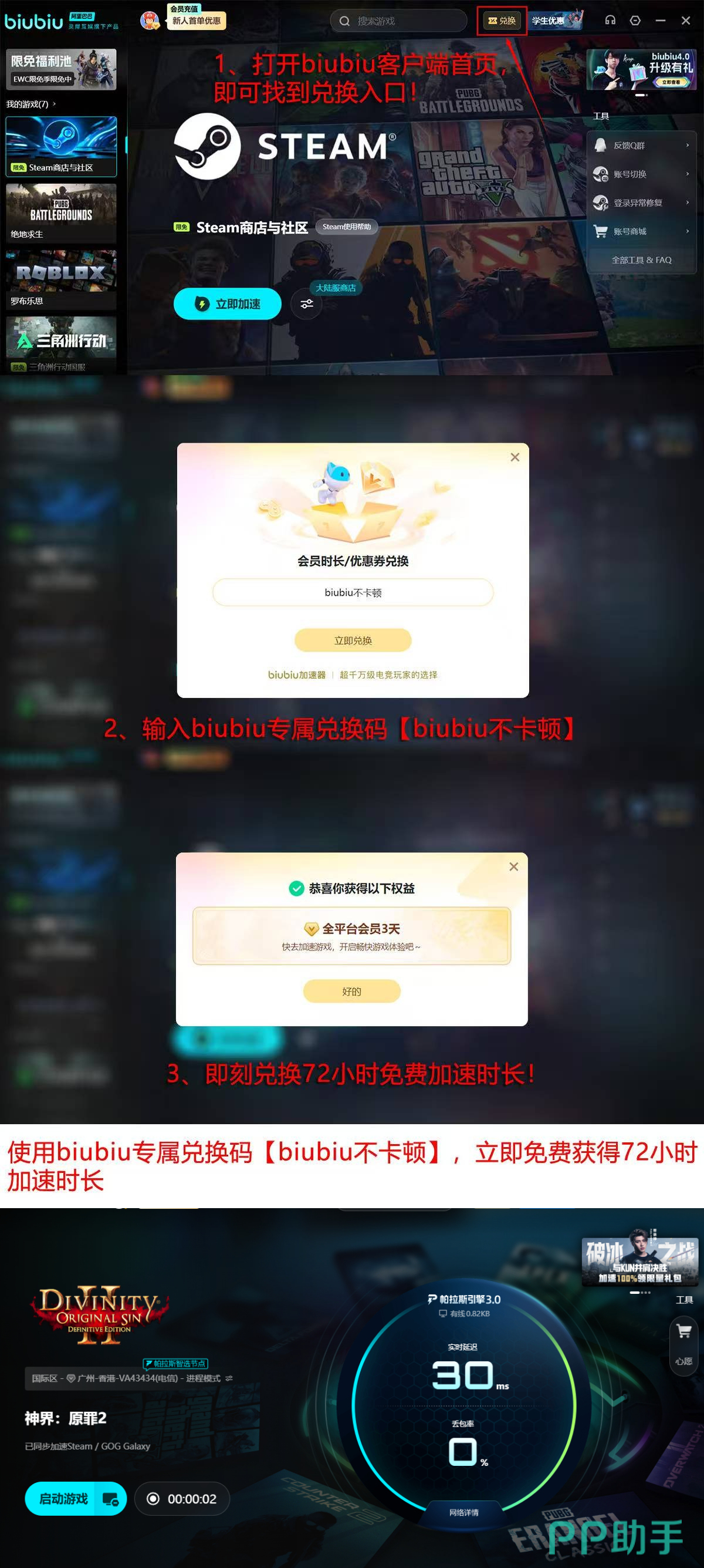 当前biubiu加速器面向新注册用户提供分阶段激励政策:完成首次注册即可获赠24小时免费加速时长;在激活界面输入兑换码【biubiu不卡顿】,还可额外领取72小时连续加速权益,累计达96小时,充分验证网络优化实效。