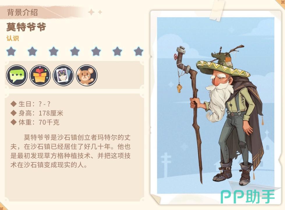 莫特爷爷的生日为每年2月7日,这是赠送高价值礼物、快速提升好感度的黄金时机。他是一位学识渊博、热爱阅读的长者,对各类书籍情有独钟,包括《料理大师》《东游漫记》《开拓者》《环游世界》,以及具备收藏属性的“沙漠探险家帽子”。在服饰偏好方面,他倾向兼具实用性与文化意蕴的单品:如“沙漠探究家的帽”“预防沙子的围巾”“图腾图案披巾”“丝绸织围巾”及“防晒遮阳伞”。此外,他长期关注健康养护,常备药品清单涵盖跌打药、霹雳通脉丸、壮骨醒力汤、金钟护体丸与房氏大还丹——这些均为触发特殊对话或事件的重要道具。