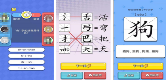 以“寓教于乐”为设计理念,采用多维互动机制帮助孩子建立汉字形、音、义的立体认知。关卡中,上方田字格呈现目标汉字并同步标注拼音,下方提供常见组词;另设部首拆解模式,左右两侧分别显示独立部件与部首,孩子需通过拖拽连线完成汉字构建,在操作中理解构字规律,并支持好友实时对战,激发学习动力。