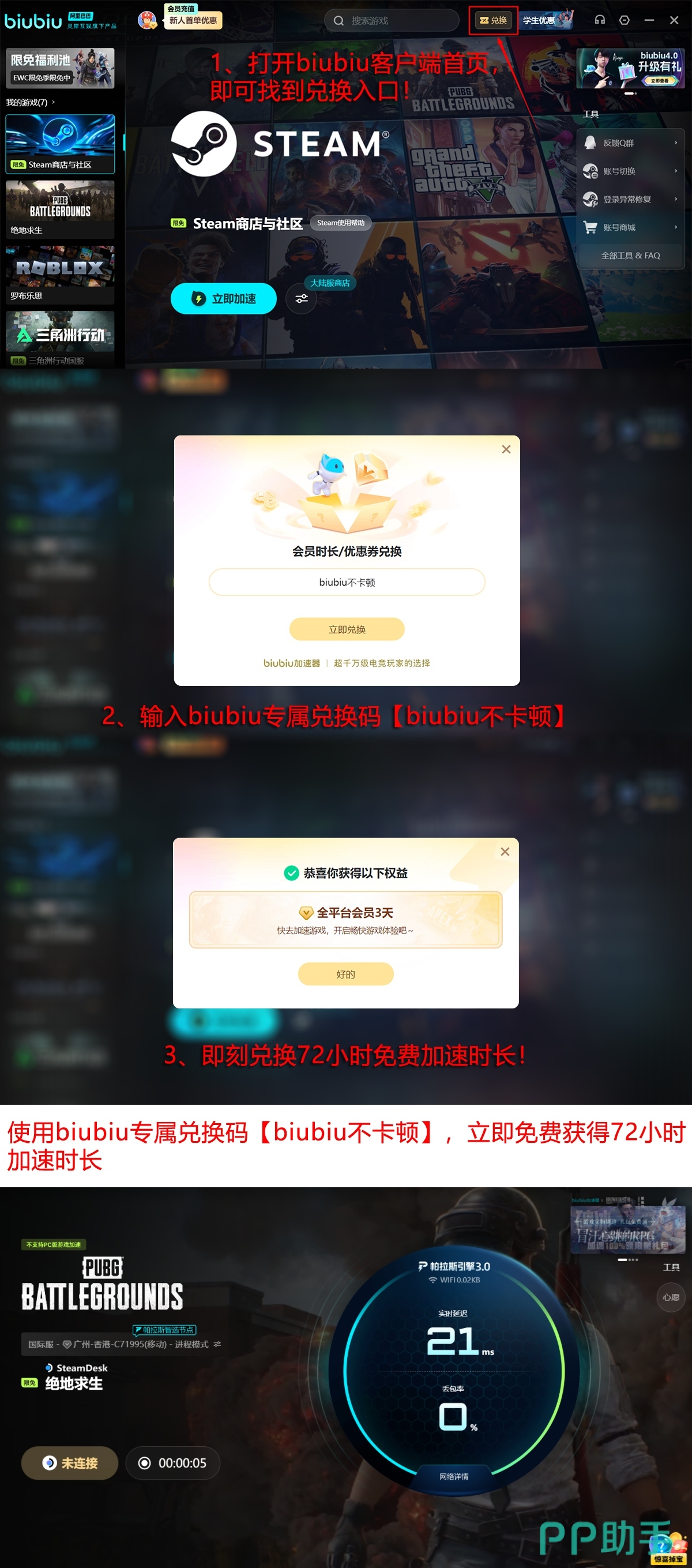 在服务权益方面,新用户完成注册即可获赠24小时全功能免费使用时长;登录后于首页输入兑换口令【biubiu不卡顿】,还可额外领取72小时服务权限。两项叠加总计96小时体验期,足以覆盖完整调试周期与多轮实战验证。