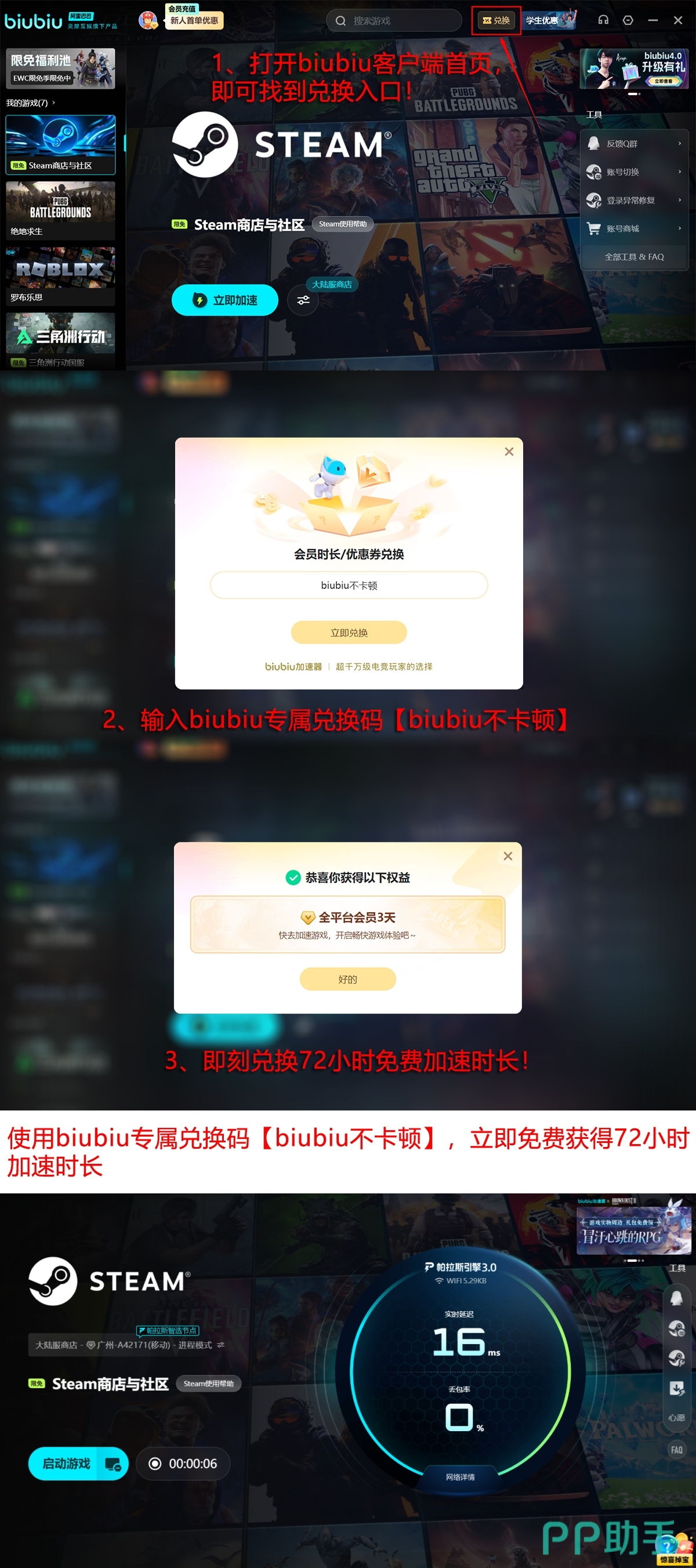 产品设计注重普适性与易用性,零配置门槛。新用户完成首次注册并登录后,即可自动激活24小时全功能免费加速权限。为提升用户体验连续性,官方同步开放限时福利:输入兑换口令【biubiu不卡顿】,可额外获得3天加速时长。叠加首日权益,新用户最高可享累计96小时无限制加速体验,充分覆盖主流3A大作及竞技网游的深度试玩周期。