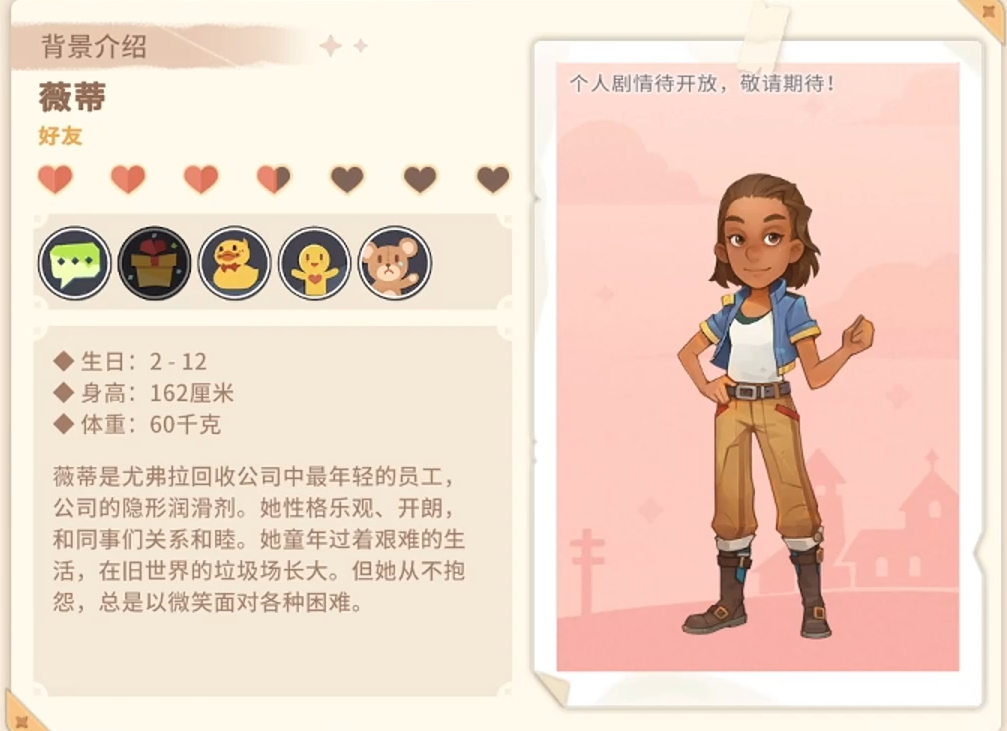 在《沙石镇时光》中,薇蒂是我们在游戏中前往尤弗拉回收公司中,遇到的一位NPC。薇蒂作为该公司的员工,其性格乐观开朗,总是带着云淡风轻的从容感,也是公司中隐形的润滑剂,和同事们关系和睦。薇蒂童年和薇薇奶奶一起过着艰难的时光,总是在旧世界的垃圾场中徘徊,但她本人却没有任何抱怨,总是以乐观的心态从容面对生活中的各种麻烦,可以说是非常乐观的一个人。