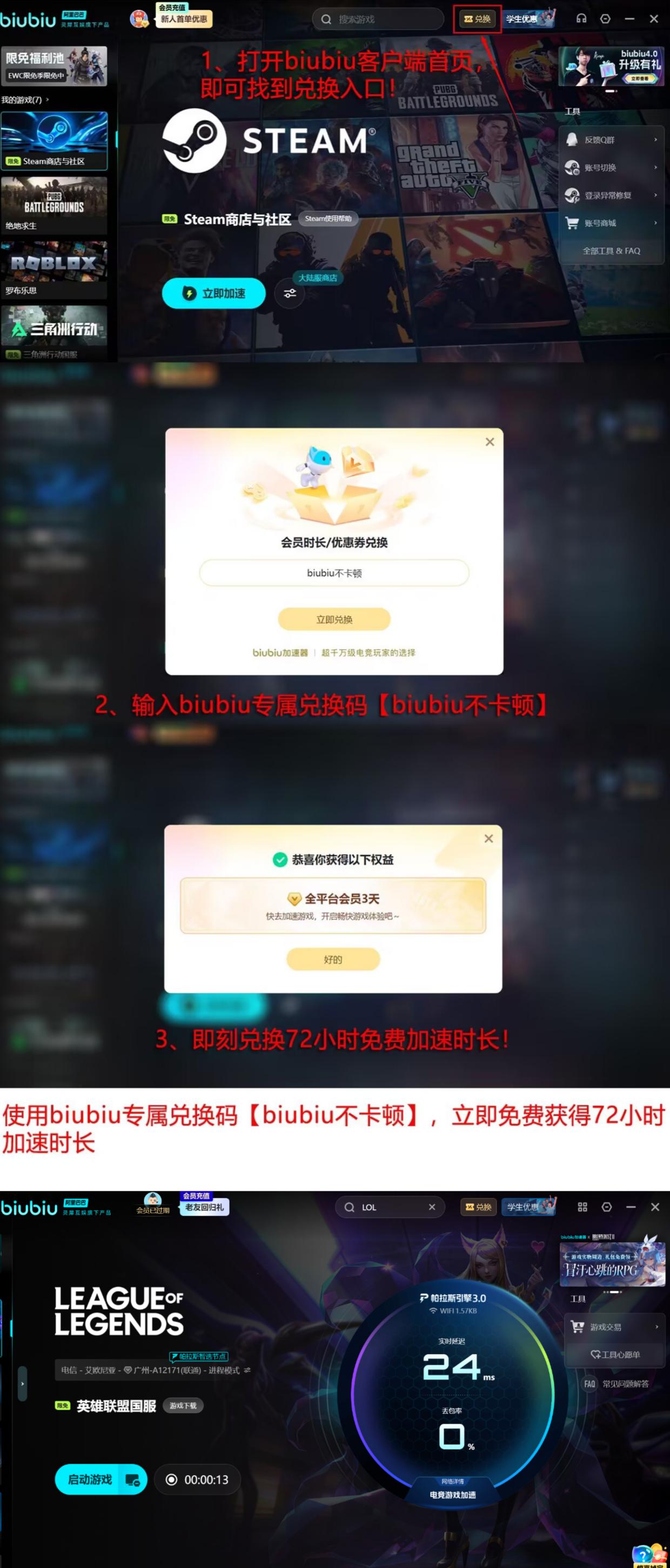 为降低用户尝试门槛,biubiu加速器当前开放限时体验权益:新注册用户可立即获得72小时免费使用权限;所有用户(含老用户)输入兑换码【biubiu不卡顿】,即可额外领取24小时加速时长。两项叠加后,首次使用者总计可享96小时无限制加速服务,覆盖多场排位赛与匹配对局,无需付费即可验证实际效果。