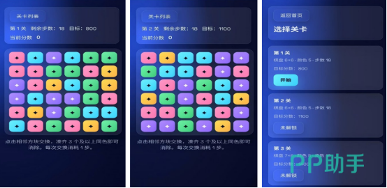 本作采用高饱和度霓虹玻璃质感美术风格,构建出极具视觉张力的关卡场景。全游戏包含大量差异化设计的关卡,每关目标明确:例如第1关为6×6网格棋盘,含5种颜色方块,需在18步内达成800分。核心规则为点击相邻方块交换位置,当3个或以上同色方块呈横纵直线排列时触发消除;单次消除数量越多,得分加成越显著,步数消耗恒为1次/交换。