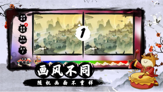 以东方修仙世界观为背景,采用细腻手绘风画面呈现双图对比玩法。每组图片高度相似,差异点涵盖元素增减、色彩明暗变化、局部纹理偏移等维度,考验玩家观察精度与细节捕捉能力。关卡设定明确目标数量,需在限定范围内找出全部差异方可推进。