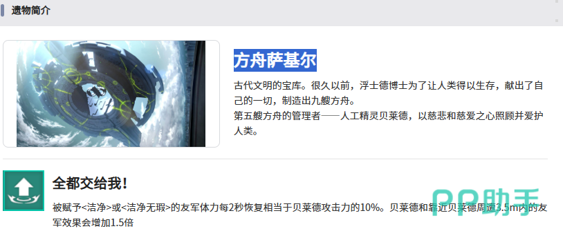 后期根据她的遗物方舟萨基尔,可以带来一物技能叫做全都交给我,通过这个有技能,贝莱德是可以赋予更多的洁净状态或者是洁净无暇状态的加成,这些状态基本都是给队友进行体力恢复的,而且每2秒的时间之内都可以恢复,其中相当于贝莱德攻击效果上面有10%的数值。