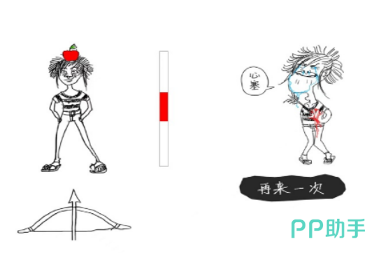 本作以极简射箭机制为核心,玩家通过点击屏幕调节弓箭角度,瞄准主角头顶的苹果进行射击。失误并非失败,而是笑点的起点——若误中人物本体,其夸张变形、惊恐翻滚等即时反馈动画极具喜剧张力。整套操作逻辑清晰,三秒即可理解,但精准命中需反复练习,形成“屡败屡笑”的独特体验循环。