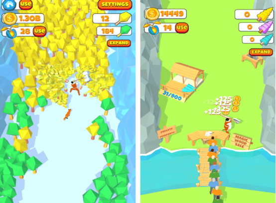 玩家将会成为一名专业的伐木者,采用的是3d的画面风格,利用砍树卖树能够升级道具,整体的游戏节奏特别的快,给大家带来轻松又有趣的游戏氛围。在树木甚至是里面的人物上,都采用的是比较简约的设计风格,控制着里面的人物,砍树的过程当中,走的越远,越能得到价格贵的树木,其中就包括有奖励的魔法黄金树,在砍伐以后,更能帮助玩家获得丰厚的奖励。