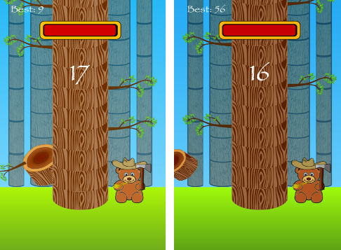 这款以可爱的小熊伐木为主要玩法的休闲游戏,除了操作方法简单,也能够给大家带来很好的趣味性,在可爱的小熊砍树的过程中,你需要点击屏幕,根据每个树木的位置利用左右移动位置的方式,就可以让小熊顺利的完成砍树的任务。主要的难点就是游戏随着时长增加,难度也会增加,要避免碰到已经降落的树枝,才能获得更高的分数。