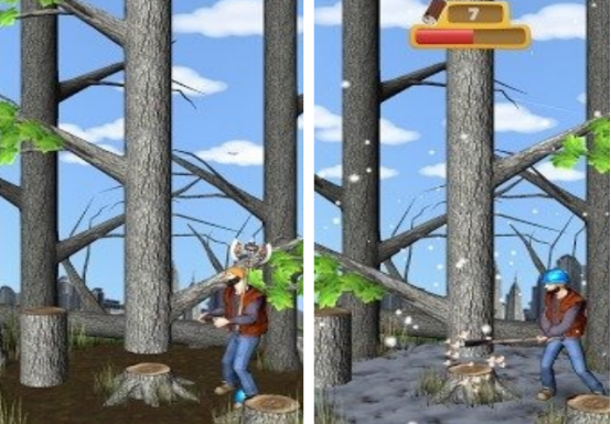 玩家将在这款游戏当中成为专业的伐木工需要有很好的眼力,在最快的速度中完成树木的砍伐,就能获得分数。有着简单的操作方法,单手就能够操作,只需要点击屏幕左右两侧,在躲避树枝的同时,顺利的将树木砍伐,就能够获得分数奖励。从始至终都要仔细的对屏幕进行观察,发现树枝掉落的话,要及时的利用点击屏幕躲避。