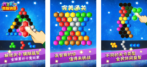 六边形益智消除这款消除APP有着特立独行的操作概念,不同的关卡需要利用特殊的思维才能通关,休闲益智的气氛塑造带来极为解压的好心情,上千万下载量足以证明这是一款质量不错的手游,更有许多高智商的解谜模式可以参与,五颜六色的六角形拼图消除画面辨识度也是很高的哟。