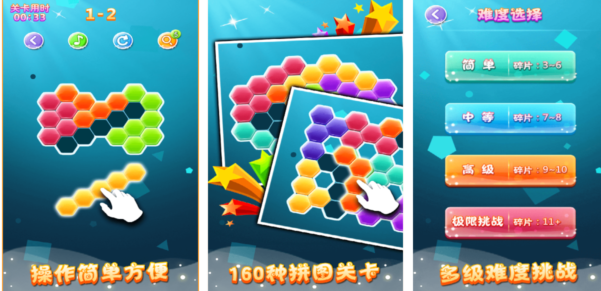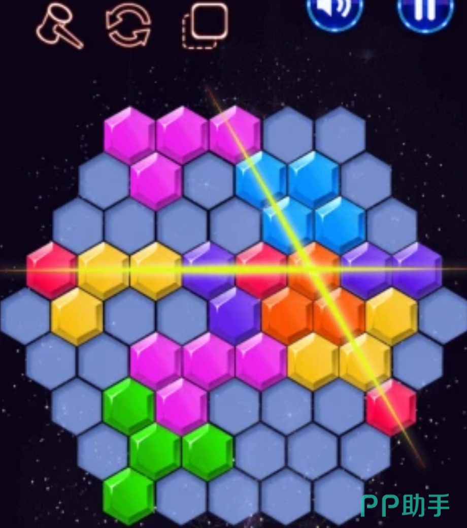 《六边形消消乐》把经典的方块消除逻辑与蜂巢结构的几何美学深度结合在一起,游戏摒弃了传统的四向消除,改为六向平行的消除规则,玩家需要把随机出现的组合色块填入巨大的六边形棋盘里,只要在任意方向上形成整行填充就可以触发消除。该作最出彩的地方在于它非常讲究的碎块算法,每一轮刷新出的形状都给玩家的剩余空间管理带来了严峻的考验。