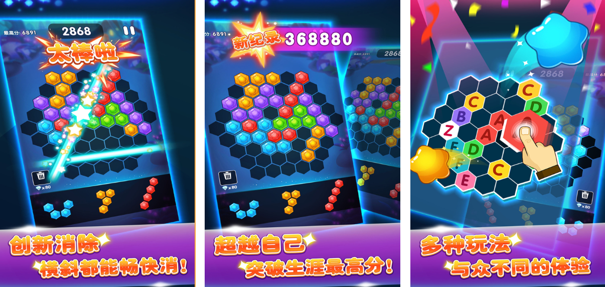 《六边形消消消》是一部把极速竞技感和高频消除反馈完美融合在一起的作品。它对传统的六边形逻辑做了一定程度的动态化改良,加入了时间压力和连击加成系统,玩家需要在限定的时间内通过快速的图形堆叠来达到清屏的目的。该作最大的特点就是物理交互效果非常成熟、色彩流动感很强,每一次成功的消除都会引起绚丽的粒子扩散。游戏有详尽的技能树系统,玩家可以用收集到的金币兑换消除特效,也可以实时在线排名。