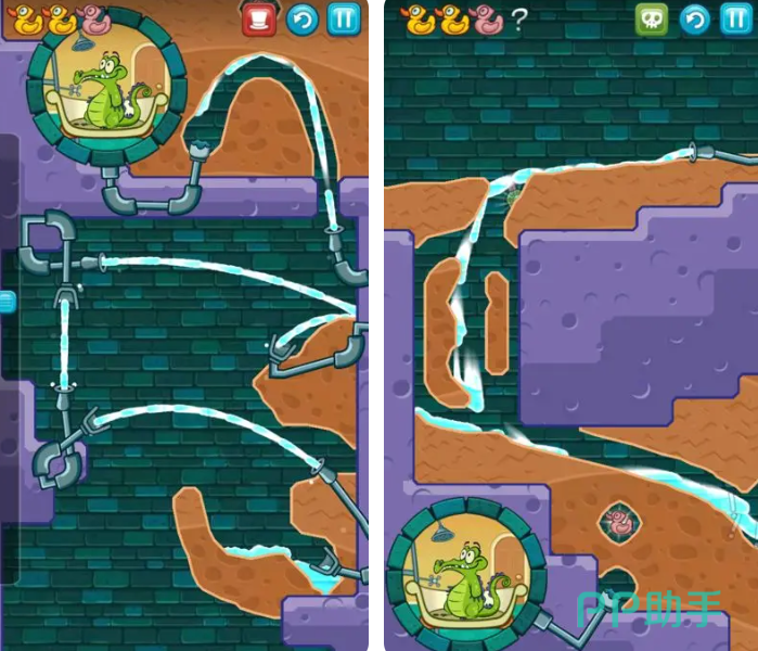 整个游戏的目的就是非常简单,为了能够让这个小鳄鱼洗上澡。但是洗澡的水管却让玩家们头疼不已。想要将水流引入到澡堂中可不容易,游戏的水流转换过程中,更是玩家们难以解决的问题,而这些就需要玩家们慢慢解谜解决困难了,游戏中的每一个角色都有着特别设计的装置,所以玩家们完全可以勇敢尝试,当玩家们感到气馁的时候,不要忘记还有着解谜暗示哦。