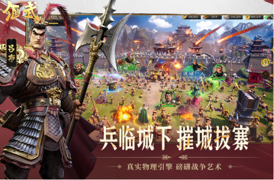 基于乱世纷飞的三国题材上所创作。化身为一方诸侯的你,在超大的地图场景当中,通过建设主城或者是采集资源等一系列方式,加入实时的大规模城镇攻防战中,其中自动战斗的模式,降低人们的操作门槛,很多兵种类型之间都秉持相互克制的关系,大家通过强化武将或者是获取装备的方式,提升实力,需要以智取胜。