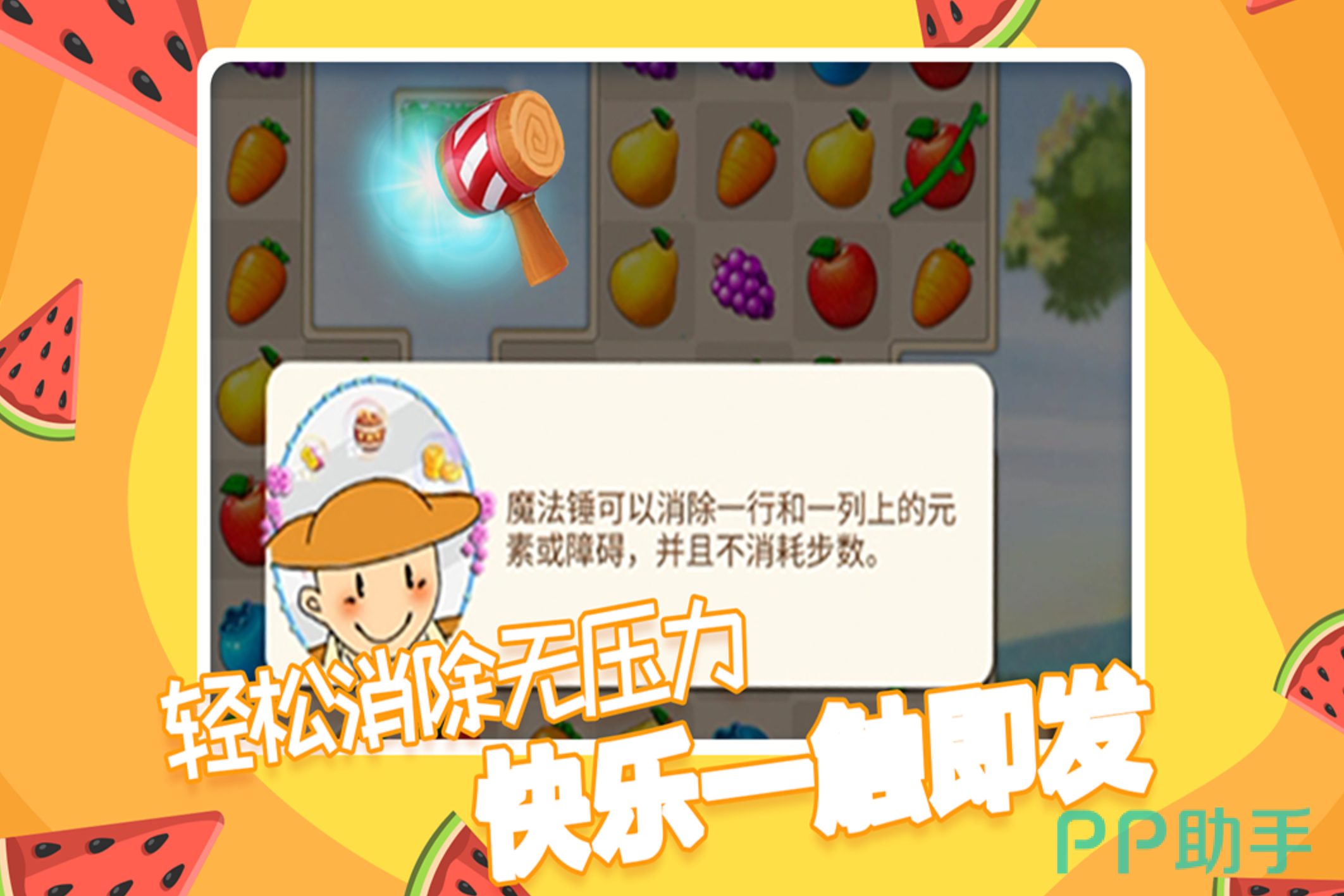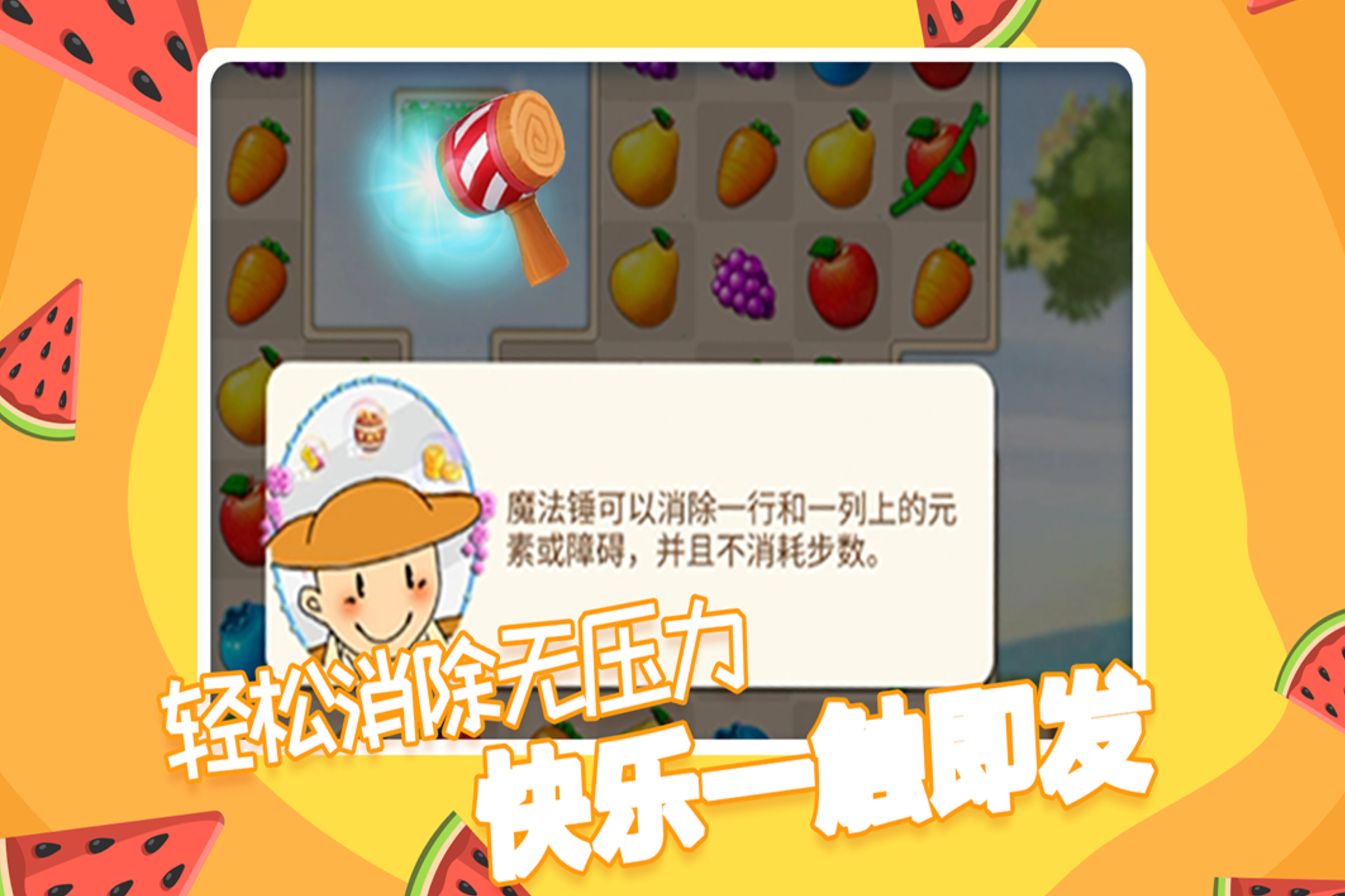 果园主题搭配农夫角色,整体氛围偏向田园风。三消玩法和庄园经营结合在一起,过关拿到的星星,可以用来装修小店,装修完可以解锁卡牌和道具。消除四个以上水果,可以生成特殊道具,直线爆破清掉一整行,水果旋风范围消除,全屏轰炸直接清空棋盘。关卡地形和水果搭配,都不一样,难度慢慢往上爬,后期会加入各种障碍元素。画面是Q版卡通风,多种水果都带点萌感,背景音乐轻松。