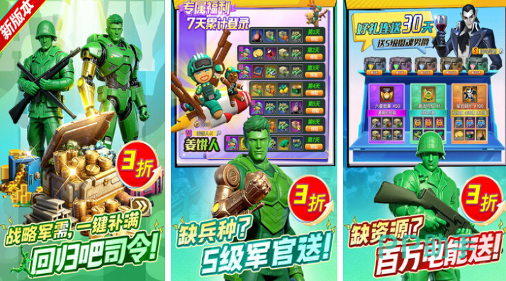 这是款有关于玩具兵人主题的策略战争手游,你作为兵人小队的指挥官需要完成形形色色的战斗任务,绿色的兵人种类很多可组合不同的军队,新手玩家可以在军需系统中获得各种各样的奖励道具,不断升级军队获得更多资源的设定代入感十足,满屏都是兵人玩具的既视感让90后玩家回归了童年。