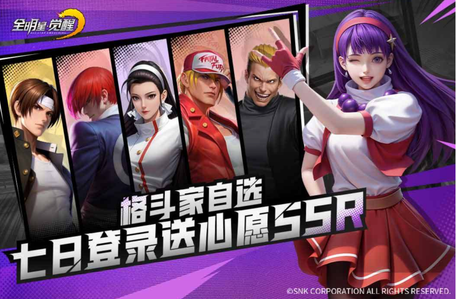 SNK授权的格斗卡牌游戏,八神庵、草薙京、不知火舞,我们所熟知的都一比一还原。战斗是自动推进的车轮战,角色会按设定,释放连招和必杀技,技能特效,还原街机时代的感觉。游戏把以前街机里的背景,做成了可以走动的场景,玩家可以到街道和酒吧里面去转转,还有隐藏彩蛋可以触发。登录就送稀有角色,天天能自选SSR,养成材料给得足够,零氪也能拉满战力组队伍。